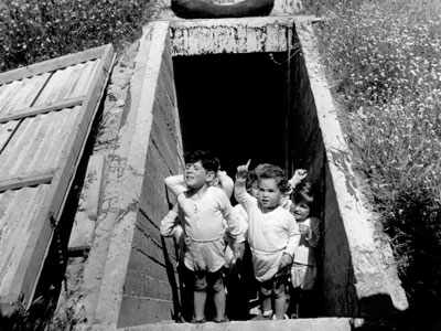 1939, UK — A family, each carrying their gas masks in a little box, enter an underground air raid shelter