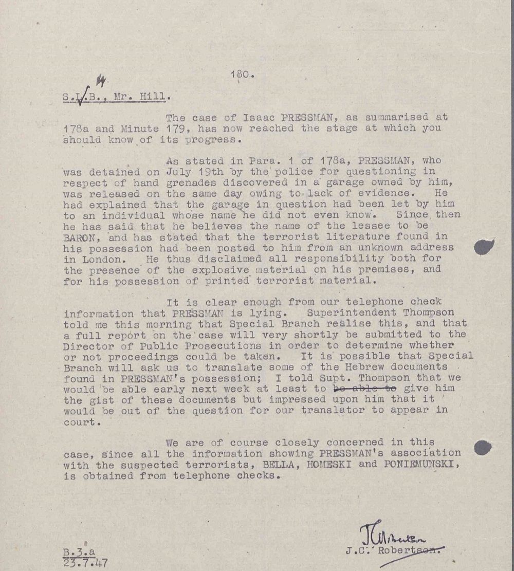 Here is an account from the MI5 files of 1947 of an Irgun cell who were storing explosives and other terrorist materials and were questioned but none of them was ever even arrested, never mind jailed. Two key Irgun operative Isaac Pressman and Leo Bella were involved. As you can see the presence of the Irgun literature and the 24 grenades and 24 detonators were explained away. Pressman insisting that he had rented out the garage concerned had no knowledge of the weapons.