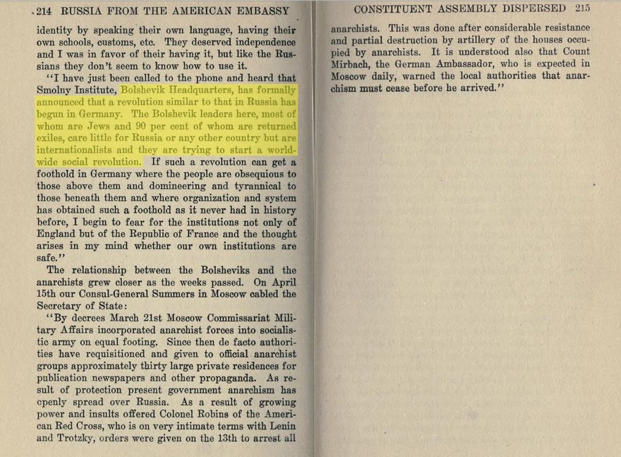"The Bolshevik leaders here, most of whom are Jews and 90 percent of whom are returned exiles, care little for Russia or any other country but are internationalists and they are trying to start a worldwide social revolution."