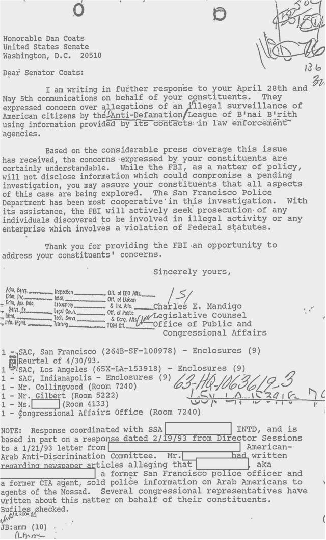 Mailbags of letters to Congress were forwarded to the FBI and attorney general urging the swift criminal prosecution of the ADL. Robert Kerrey, John McCain, Richard Lugar, Hank Brown, Jill Long, Dennis DeConcini, and Ernest Hollings, while often distancing themselves from the substance of the complaints, dutifully forwarded the outraged letters. The FBI’s Legislative Counsel Charles E. Mandigo reviewed demands to prosecute both the ADL and “a former San Francisco police officer and former CIA agent [Thomas Gerard]” who “sold police information on Arab Americans to agents of the Mossad.” Mandigo assured them “the FBI will actively seek prosecution of any individuals or any enterprise discovered to be involved in illegal activity in violation of federal statutes….” However, like earlier constituents that in the 1960’s demanded another Israel lobbying organization, the American Zionist Council, be registered as an Israeli foreign agent, they were all in for a huge disappointment.