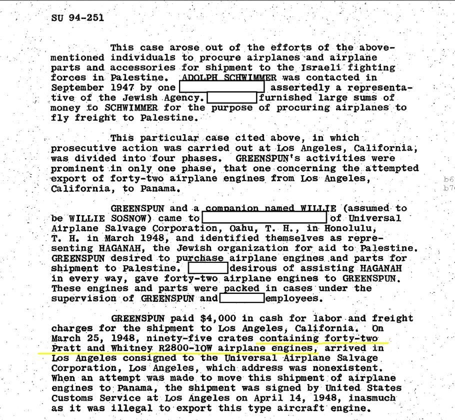 But Greenspun would be found guilty of smuggling the machine guns that would go with the planes as well as artillery and ammo. He stole 30 and 50 cal machine guns from Hawaii and shipped them to the Haganah in Palestine through Mexico. When he was indicted Greenspun tried to bribe his way out. He offered $25,000 to Seth Solomon Pope "or anyone else designated by Pope" to "quash" a second Neutrality Act indictment against him. Solomon worked in Hawaii at the War Assets Administration, in charge of decommissioning and selling off WWII surplus. He was most likely the original contact for the smuggling. The man was investigated three time for fraudulent sales. They also stole over 500 machine gun barrels. Reportedly Hank took an additional 10% kickback from arms sales he made. A Grand Jury in Los Angeles indicted Hank and six other of violating the Neutrality Act and Export Control Law, Title 50 United States Code section 701 and Title 22 United Stated Code, section 452. However he got only a 10k fine and no jail time. Greenspun was paid through the SSE. The SSE was a front for the AJDC's Lishka which financed communist and Bricha illegal immigration. The Jewish Agency which was the government in waiting that organized the terrorist groups that formed Israel, facilitated the cash flow to gun runners like Frank. In "Concealed in the Open: Recipients of International Clandestine Jewish Aid in Early 1950s Hungary", Zachary Paul Levine, of Yeshiva University Museum writes: