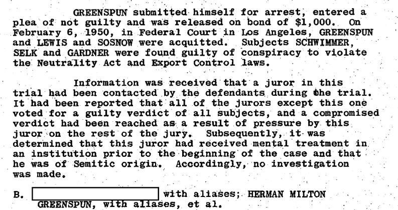 After jury tampering, with the sole Jewish juror meeting with the defense, Greenspun and two of his cohorts William Sosnow, and Samuel Lewis were acquitted, but his other partners Adolph Schwimmer, Leon Gardner, Renoyld Selk, and Abraham Levin, were convicted.