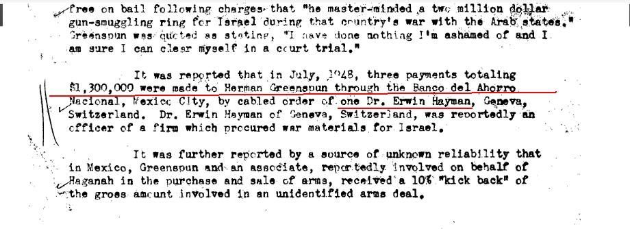 The JDC-Israeli collaboration that formed around clandestine emigration to Israel and welfare to migrants filled the vacuum with the creation of two institutions. The first was created in 1952 by the Israeli government's Liaison Bureau of the Israel Ministry of Foreign Affairs, or Lishka by its Hebrew acronym, which collected information and administered individual aid. The second was created in Switzerland in 1953. Known as the Society for Mutual Aid (SSE by its French acronym), this organization directed AJDC funds to the Lishka and represented Jewish aid providers' interests to communist governments ...We learn from declassified FBI documents that Erwin Hayman, the same man aiding communists on behalf of the JA, is who made three transfers of 1.3 million dollars to Greenspun. Greenspun would later become the Western Director of bonds for Israel. Hayman sent the payments to Banco del Ahorro, Mexico by cable.