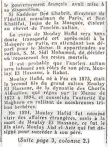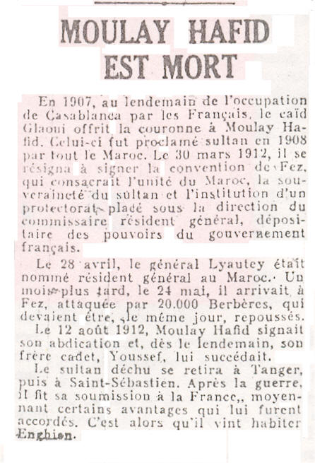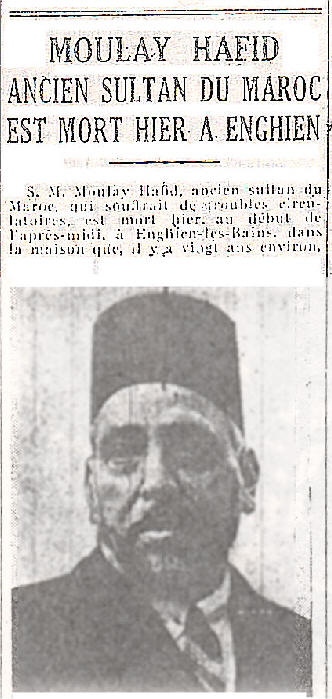 “ Mort de Moulay Hafid ancien Sultan du Maroc ”.... De façon plus discrète,