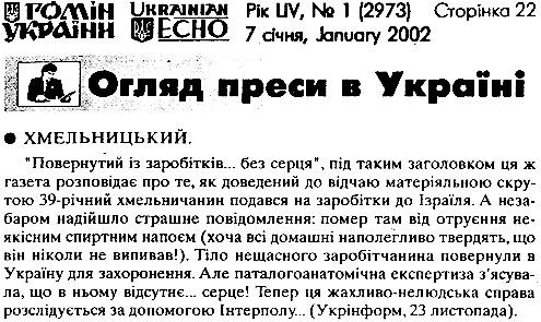 "Returned from foreign labor ... without his heart." Underneath such a headline, this newspaper relates that, reduced to despair by extreme material straits, a 39-year-old Khmelnytsky resident took a job in Israel. However, the terrible news shortly arrived that he had died there of poisoning by a tainted alcoholic beverage (even though all domestic sources insist that he never drank!). The body of the unfortunate worker was returned to Ukraine for burial. However, medical experts discovered that he was missing ... his heart! At the moment, this dreadfully-inhuman affair is being investigated with the help of Interpol.... (Ukrinform, 23 November).