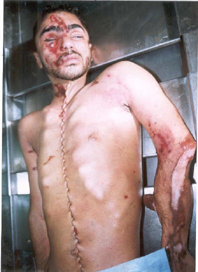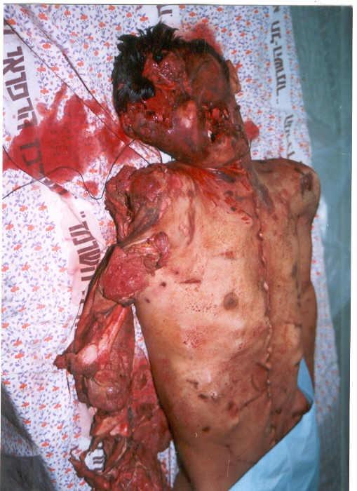 Below are two photographs out of several available that lend credibility to the above charges — supposedly Palestinians whose organs have been harvested by Jews. If the lengthy central incision has some explanation other than organ harvesting, then negative speculation could be diminished by re-publishing the photographs along with that alternative explanation. For example, perhaps such an incision results from a standard autopsy, in which case it should be explained why an autopsy is performed in a case where the victim has undergone such massive damage that the cause of death is not in question: