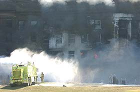 "Co se týče otázky toho letadla, jsou tam jen nějaké malé části, které byly nalezeny během hašení, ale nejedná se o nic velkého. Jinými slovy, vůbec tam nejsou kabiny a věci tohoto druhu." "Víte, raději bych to nekomentoval. Máme mnoho očitých svědků, kteří vám sdělí mnohem lépe co se vlastně dělo, když se letadlo řítilo. My to nevíme. Já to nevím."