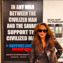 | Den zionistiske tosse Pamela Geller foran en af sine plakater hvor man kan læse mellem linjerne, at Jøderne er civiliserede mens Araberne er vilde dyr. Mere på Uriasposten. Læg især mærke til kommentar fra Lars Findsen på Crack | Her kan du læse hvad Steen fra Snaphanen ønsker sig i Julegave. |