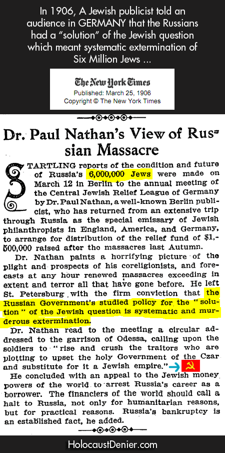 Her er et hårrejsende avisudklip fra den 25 marts 1906 (arkiveret på The New York Times officielle hjemmeside) som fortæller om, at russiske (ikke tyske!) myndigheder planlægger ”systematisk og morderisk”, at ”udrydde ikke mindre end 6.000.000 jøder” som ”løsningen på jødespørgsmålet”: