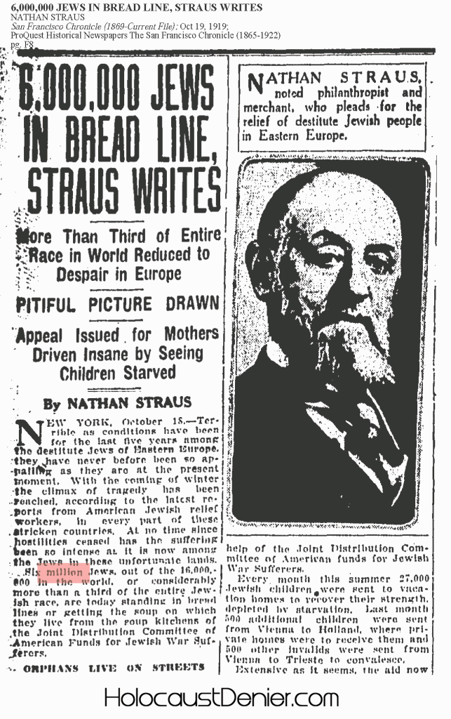 Det er altså et etableret faktum, at allerede lang tid inden ”Holocaust” påståeligt skulle have fundet sted, rapporterede jødiske massemedier om, at 6.000.000 jøder på forskellig vis udsattes for grusomheder eller blev ”systematisk udryddet”.