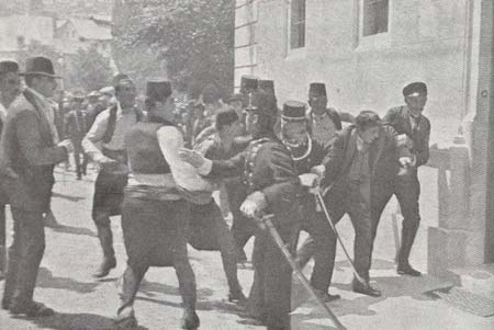 The Arrest of Princip - Barely saved from a lynching, the assassin is taken away by the police. A minor, he was not executed, but died in prison of tuberculosis shortly before the end of the war he had done so much to unleash. |