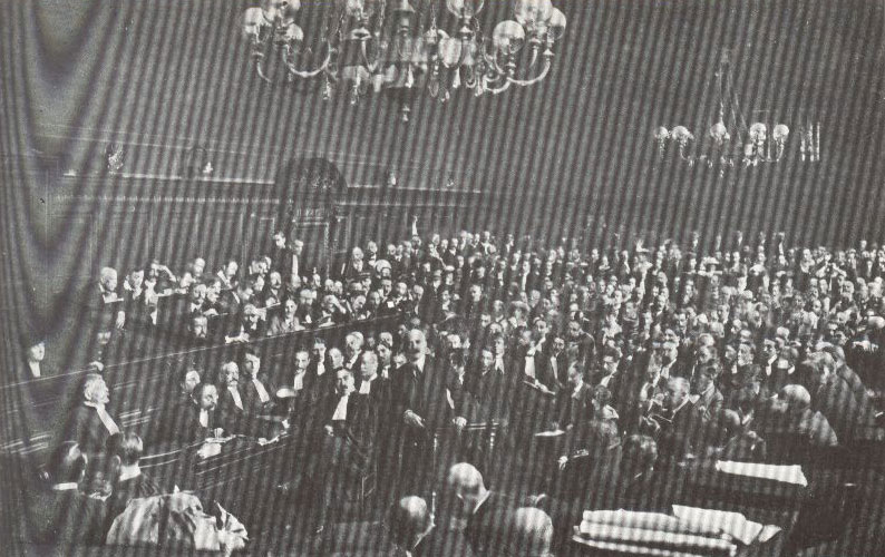 A big trial, uniquely Parisian. On the witness stand (center), Joseph Caillaux. In the dock (far left), his wife. |
