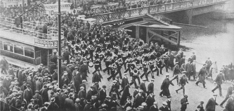 Onlookers in London applaud the Irish Guards as they march by to the accompaniment of their band. |