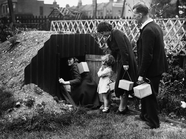 1939, UK — A family, each carrying their gas masks in a little box, enter an underground air raid shelter