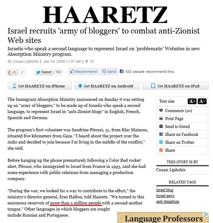 Haaretz 19.01.2009: Israel värvää bloggaajien armeijan taistelemaan sionismin vastaisia sivustoja vastaan.Israelin maahanmuuttovirasto värvää uudessa ohjelmassaan toista kieltä puhuvien israelilaisten bloggaajien armeijan edustamaan Israelia ’ongelmallisilla’, eli sionismin vastaisilla verkkosivustoilla. Ensisijaisina kielinä haetaan englantia, ranskaa, espanjaa ja saksaa puhuvia trollaajia, mutta myös venäjää ja portugeesiä puhuvia halutaan mukaan.