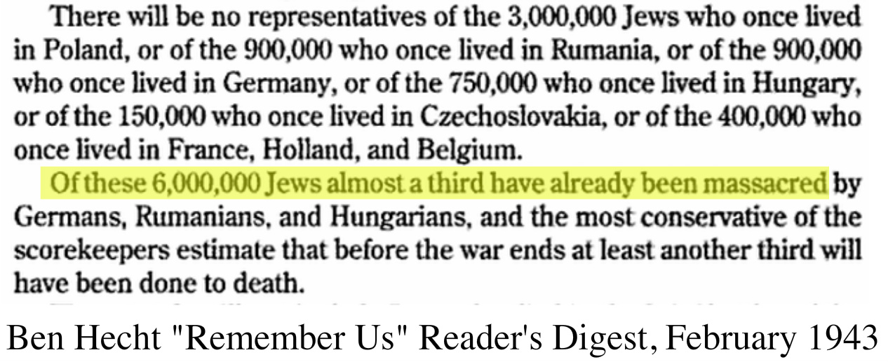 propaganda and fundraising" sourceAppearing in the February 1943 issue of Reader's Digest, an article he had written entitled "Remember Us" includes the Kabbalistic 6,000,000 figure of Jews: