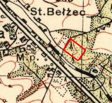 While the location given for Belzec is correct, the description of the landscape surrounding the camp is somewhat incorrect, or at least misleading. A look at a Polish map from 1937 (Illustration 2)[6] shows that the small side spur would have led more or less directly from the southern end of the Belzec station rail yard to the camp (its future perimeter marked with red by the author), with the spur measuring 500 meters, according to Israeli historian Yitzhak Arad.[7] Also, there were at least a handful of civilian structures visible from the railway spur, as well as the railway main track and a larger paved road accessible to civilians.