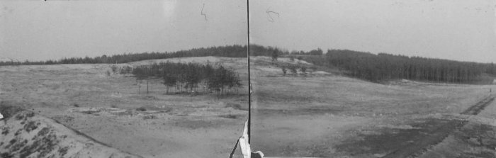 It is hard to determine whether the effects of the wild cat digs for hidden treasure are visible on a ground photo (or rather a panorama created by combining two photos) of the former camp site that was taken from its northwestern corner after the camp’s liquidation, most likely in 1945 or 1946 (Illustration 4).[61] It seems curious in the light of the above quoted Polish witness accounts that Reder, if he had really visited the site in 1945, would have described the scenery observable there as simply “a large, sunny clearing.” Furthermore, the ground photo shows that there were no trees left standing between the railway and the former camp area, so technically speaking there was no “clearing”, i.e. an open area surrounded by woods, to see at the site. The photo likewise makes it clear that if the German’s had actually planted pines or furs at the former camp site, then those young trees had all been uprooted at the time it was taken.