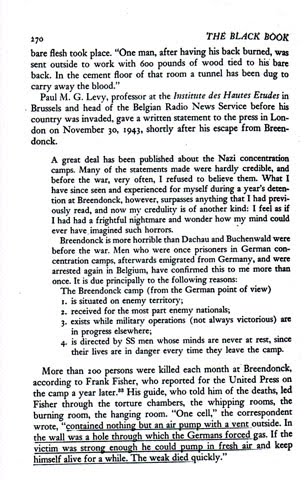PAGE 270, BREENDONCK CAMP, BELGIUM: “One man, after having his back burned, was sent outside to work with 600 pounds of wood tied to his bare back… One cell… contained nothing but an air pump with a vent outside. In the wall was a hole through which the Germans forced gas. If the victim was strong enough he could pump in fresh air and keep himself alive for a while. The weak died quickly.”