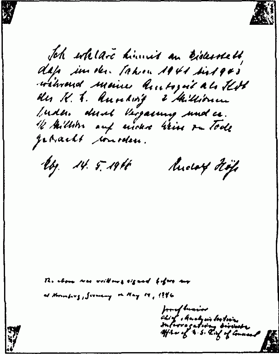 "Rudolf Höss scribbled this frank acknowledgment of the mass murder in Auschwitz on a piece of notepaper during the Nuremberg War Crimes Tribunal...Höss penciled this statement in the presence of Joseph Maier, chief of the Analysis Section within the Interrogation Division under the U.S. Counsel, who was gathering evidence from Nazi war criminals and witnesses in preparation for the prosecution at the Nuremberg trials. At the bottom of the document Prof. Maier hand wrote: "The above was written and signed before me at Nuremberg, Germany on May 14, 1946 [signed] Joseph Maier, Chief, Analysis Section, Interrogation Division, Office of U.S. Chief of Counsel".
