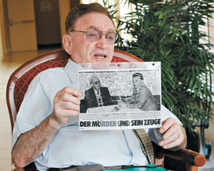 Thomas Blatt holds up a newspaper showing himself along with Karl August Frenzel, a member of