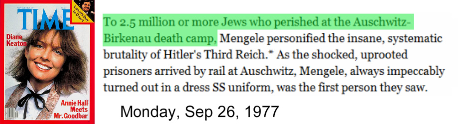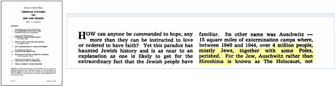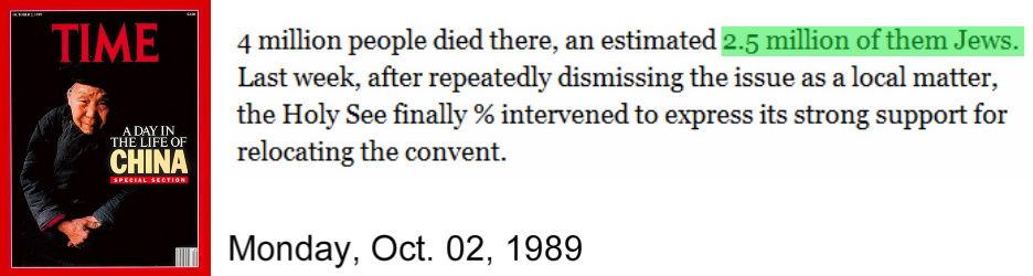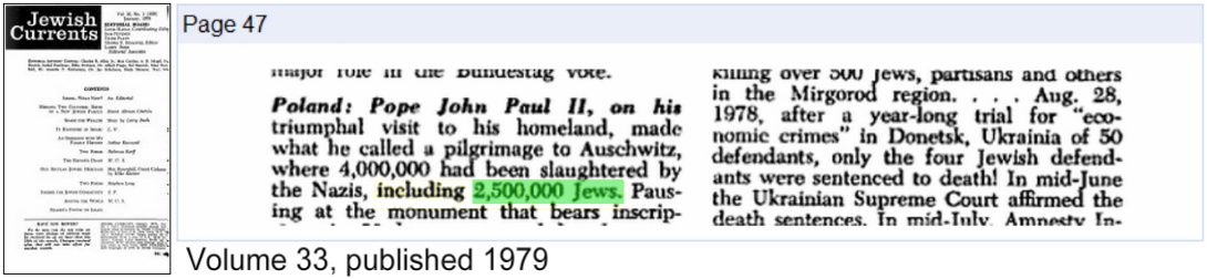 "Pope John Paul II, on his triumphal visit to his homeland, made what he called a pilgrimage toAuschwitz, where 4,000,000 had be slaughtered by the Nazis, including 2,500,000 Jews."