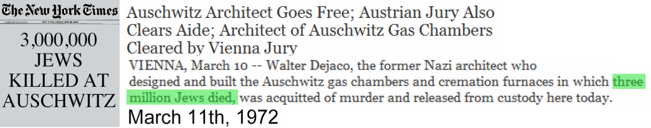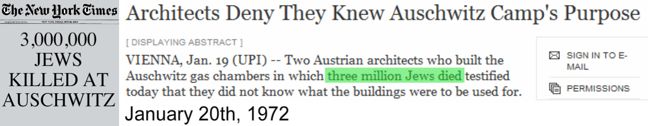"Two Austrian architects who built the Auschwitz gas chambers in which three million Jews diedtestified today that they did not know what the buildings were to be used for."