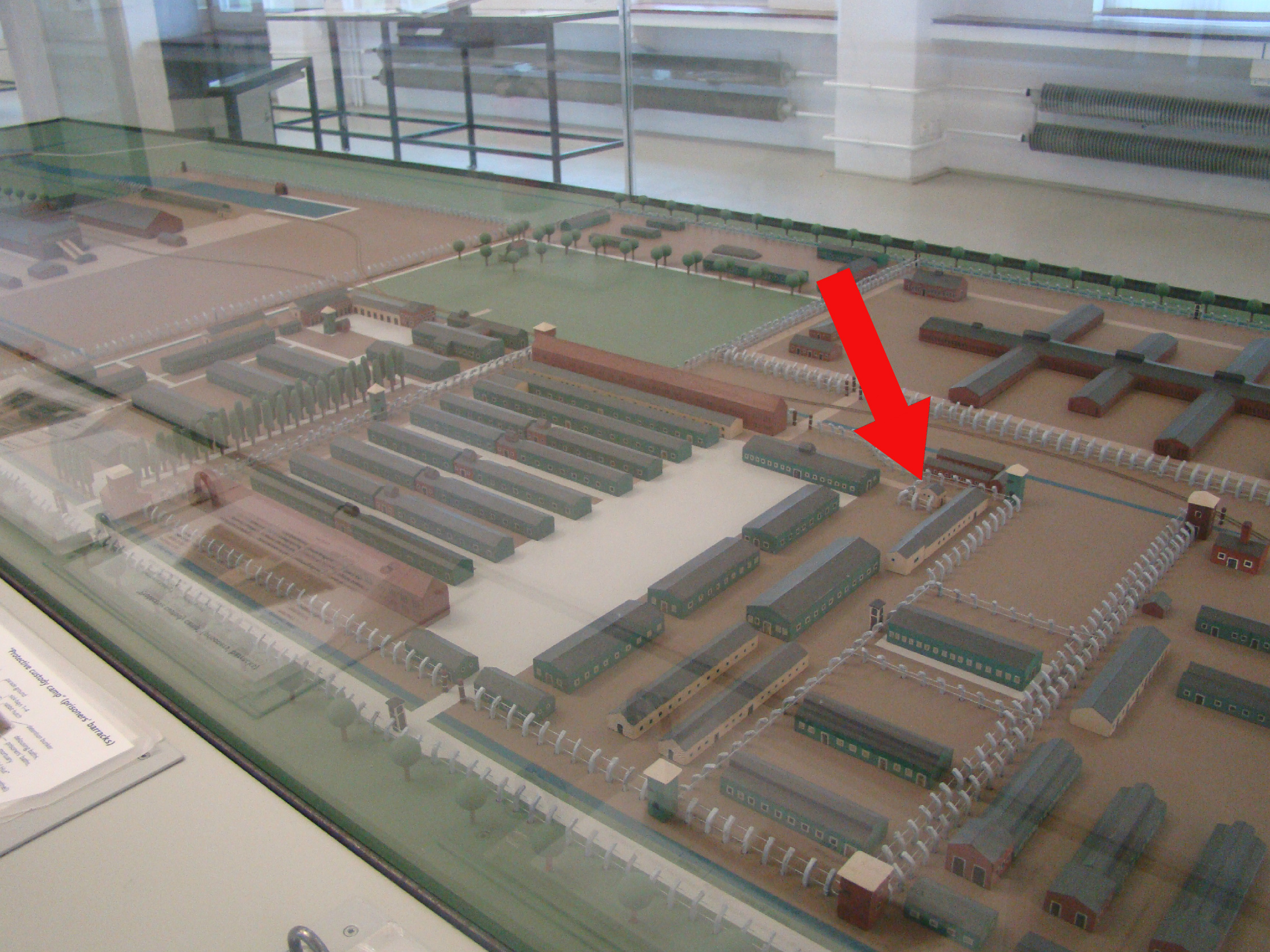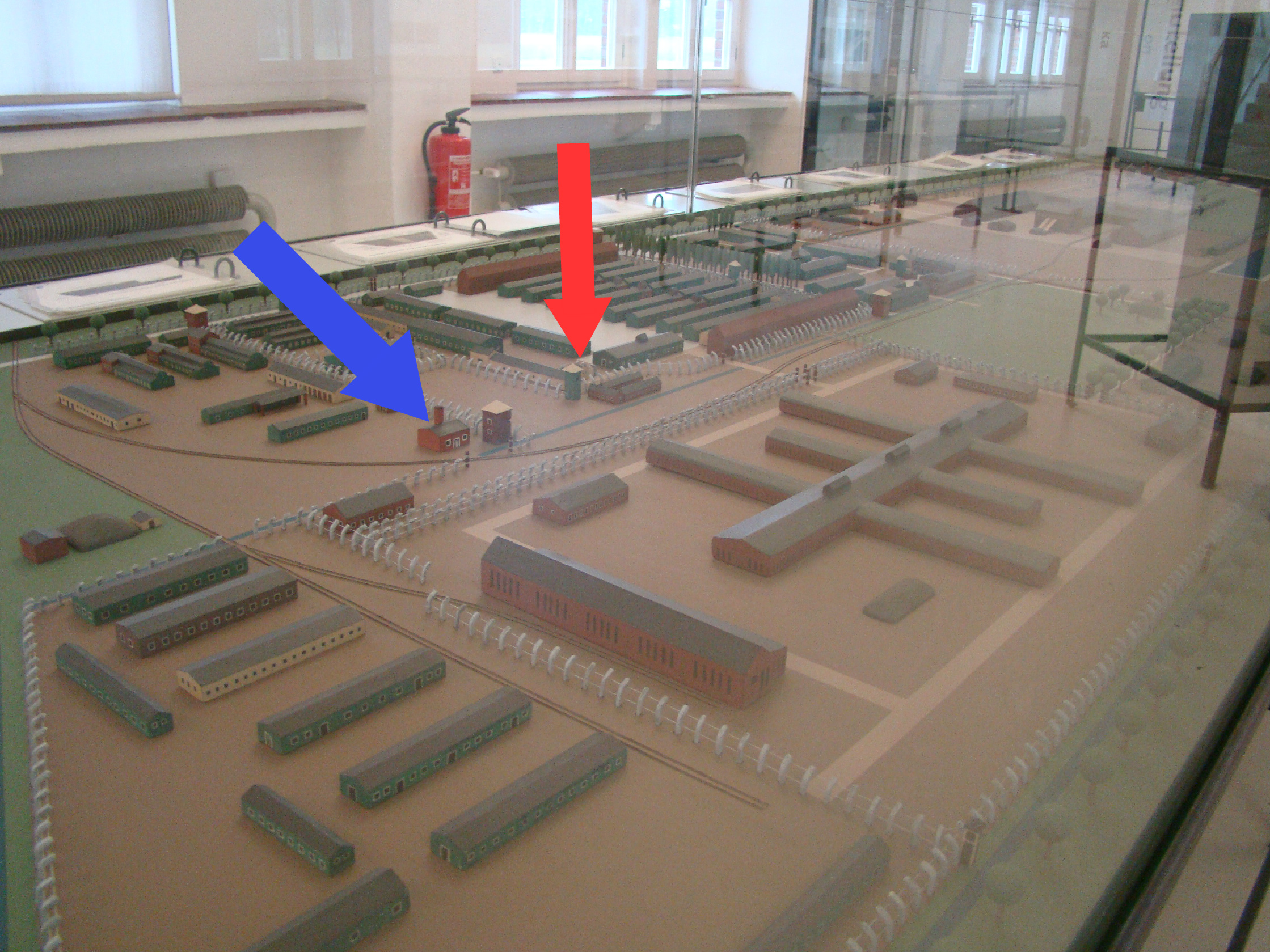 Another photo of the model of the Neuengamme camp. The blue arrow indicates