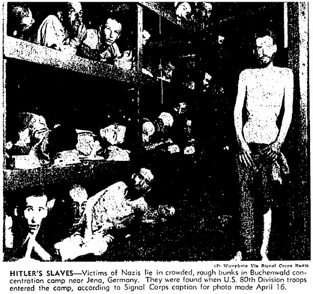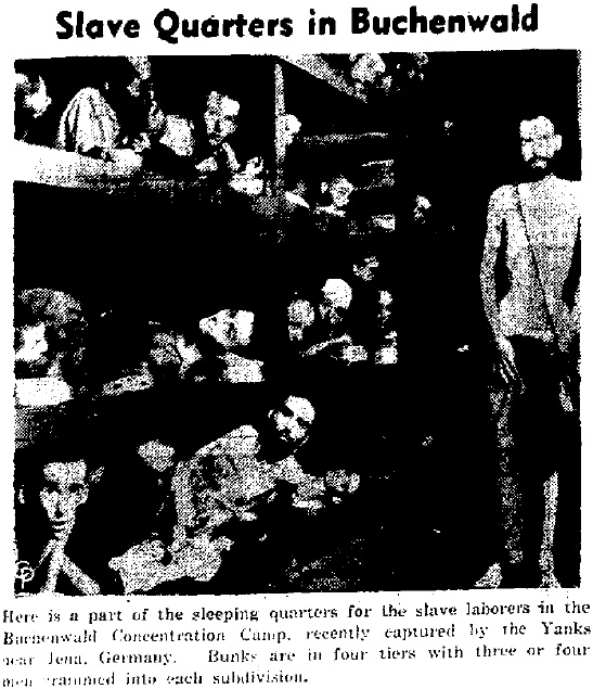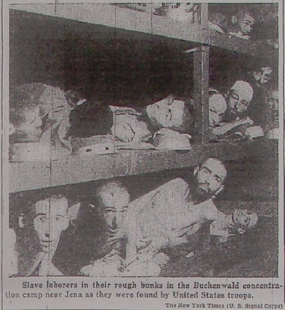 Above is the photograph which appeared in the New York Times Magazine on Sunday, May 6, 1945 (full article, parts: one + two). You might notice (my admirer Carolyn Yeager had to point it out to me) that the guy standing on the right of the photograph has disappeared (or not yet appeared, more likely). The original article can be purchased on the New York Times' online archive, here is a link to this particular story. If the link is ever broken, a search for: "Crowded bunks in the prison camp at Buchenwald" on Google news' "archive" range, will find you the story.