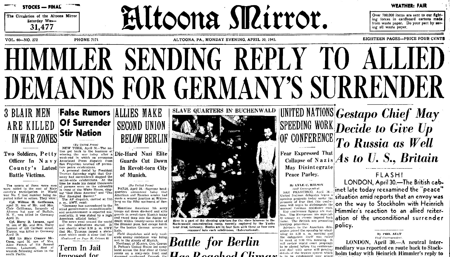 [Addendum by RI: Altoona Mirror (PA), April 30, 1945, p.1. Click image to enlarge.]