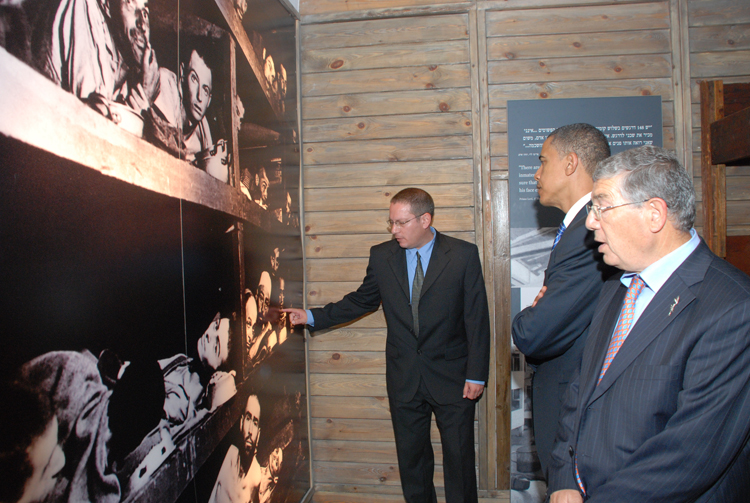 Above is Obama on his pilgrimage to Buchenwald back in 2009, he's having "Elie Wiesel" pointed out to him on a large version of the photo from which the standing man has been cropped.