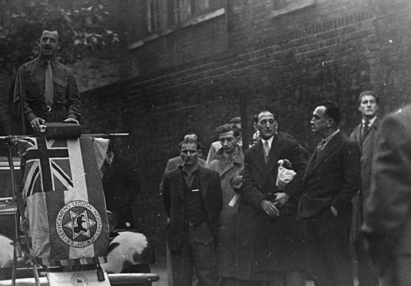 "An anti-fascist street meeting in London after the war. Many Jewish ex-servicemen joined the 43 Group’s campaign against fascism."