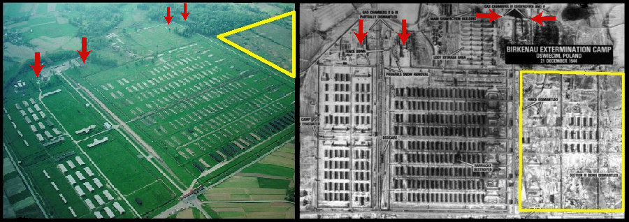 The arrows on the above photos indicate the four new crematorium (gas chambers) completed in 1943. The area marked in yellow, is the part of the Birkenau camp