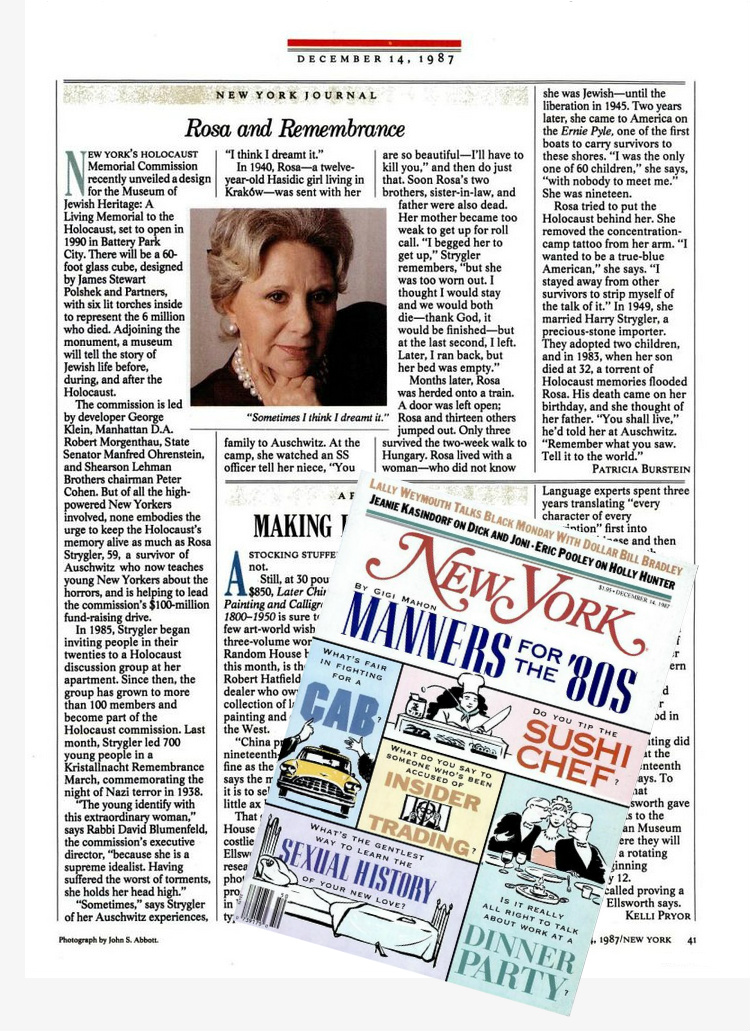 Rosa Strygler, Polish Jew from Krakow, Hasidic, in 1940(!) deported with her family all of 30 miles to Auschwitz, then aged 12. Watched an SS officer tell here niece: "You are so beautiful—I'll have to kill you," and he did. Her mother, father, two brothers and sister-in-law were also killed there. She escaped, by jumping out of a train door the Nazis forgot to close, and then walking for two weeks to Hungary. She had her Auschwitz tattoo removed after moving to the United States. "Sometimes I think I dreamt it," said Rosa.