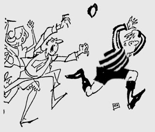 Details of Leo Goldstein are not easily found online, he was a Polish Jew, 5 feet tall and was aged 42 in 1967. The above cartoon accompanies a newspaper story from 1967, when Goldstein was attacked by football fans during a match in New York. Another story from 1959, says Goldstein was kicked by a Hatai player before the entire team walked-off the pitch midway through their game against Argentina, in protest of a Goldstein refereeing decision.