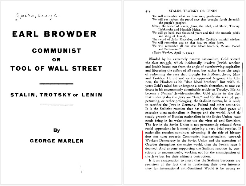 Spiro, George (pseud, for George Marlen). Earl Browder, Communist or Tool of Wall Street: Stalin, Trotsky or Lenin. New York : Van Rees Press, 1937. p.414