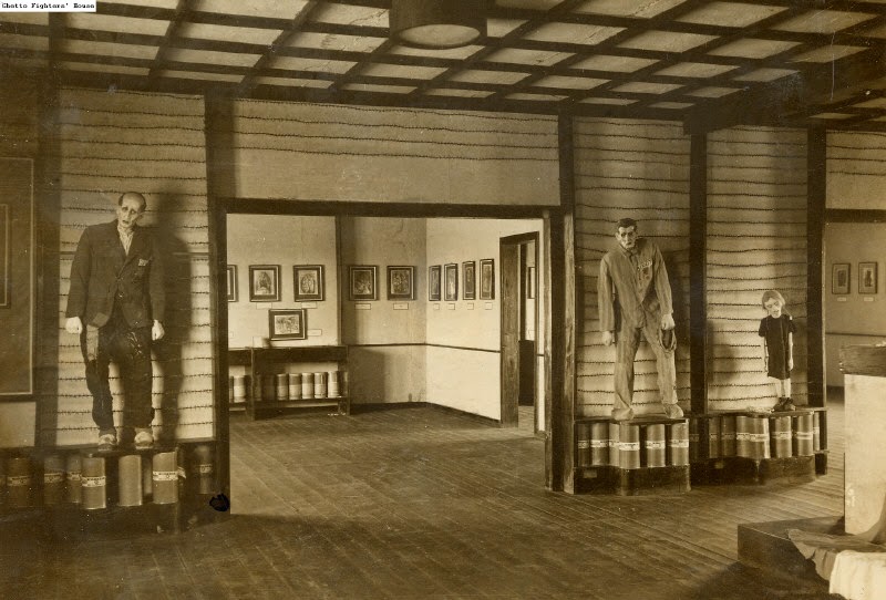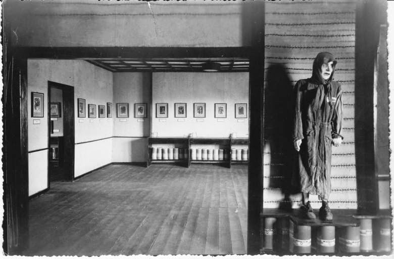 "What attracts attention in the exhibition photographs are first of all dummies with terribly emaciated faces. These figures, wearing concentration camp stripes or worn-out civilian clothes, were stood on empty Zyklon B cans. One of the photographs also shows a dummy of a child: a girl with pigtails, terribly lean, wearing a dress and oversized shoes. [...] probably to intensify the horror, a human skull was placed on one of the shelves (made by putting a wooden board on the Zyklon B cans)."