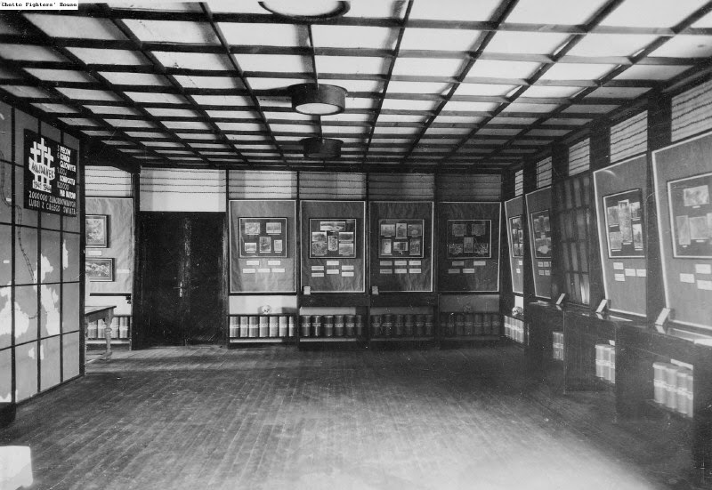 A photograph from 1945-inaugurated exhibition inside Majdanek's Barrack 62; the sign reads:4