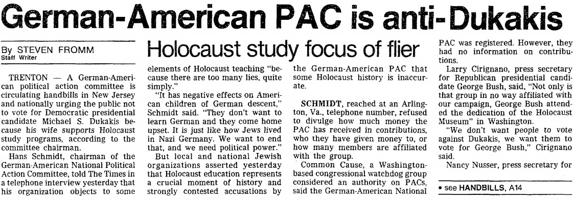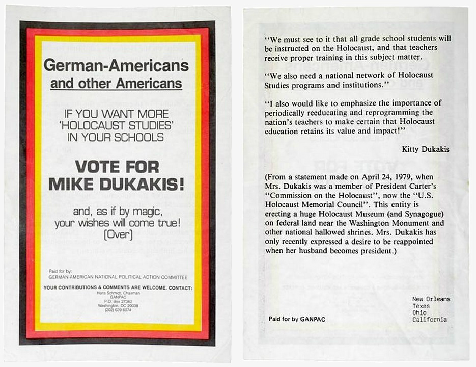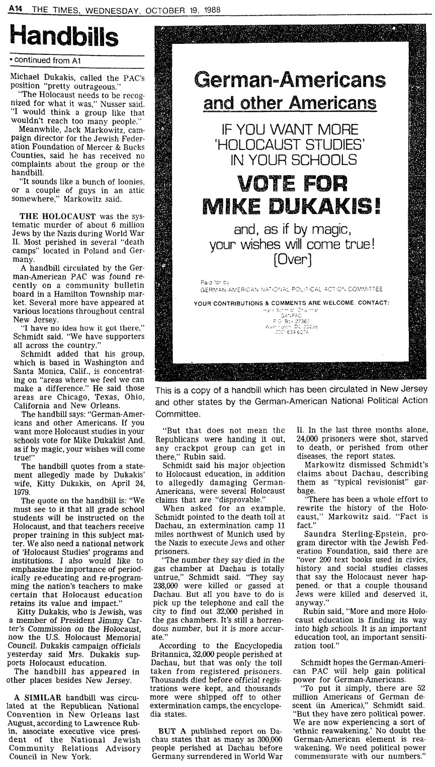 A story from 1988 about how a German-American group was campaigning against the Democratic candidate Michael Dukakis in the 1988 U.S. Presidential election due to his Jewish wife's Holocaust promotional work.