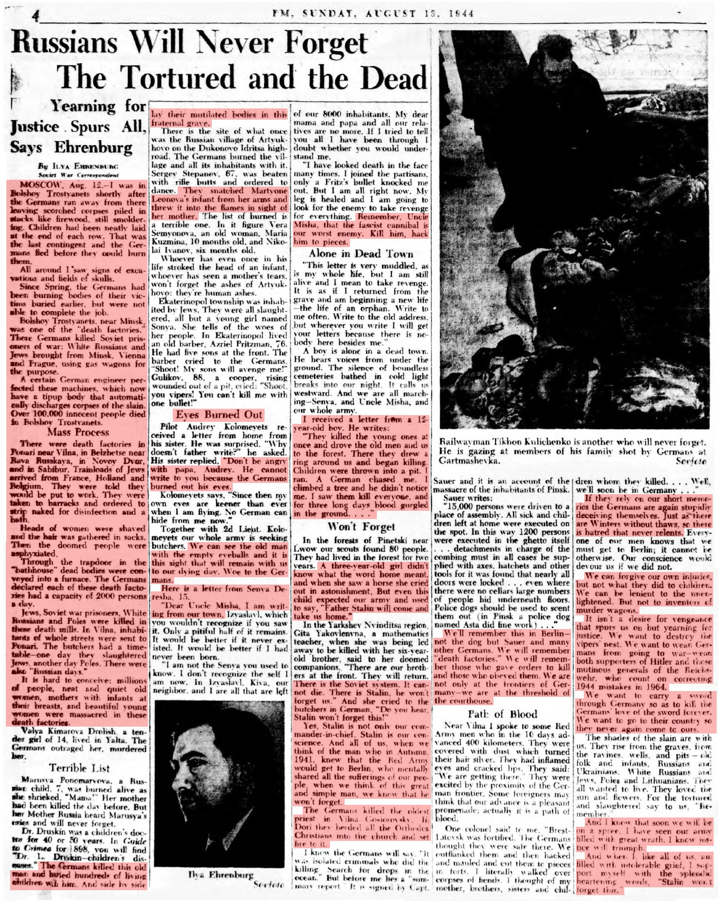 Ilya Ehrenburg informed us in August 1944, that there were German "death factories", which could each asphyxiate 2,000 people per day, in: