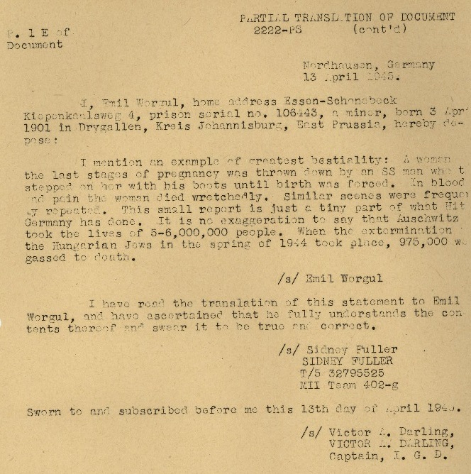 April 1945 affidavit of Emil Worgul, a part of Nuremberg trials document PS-2222 (found here):