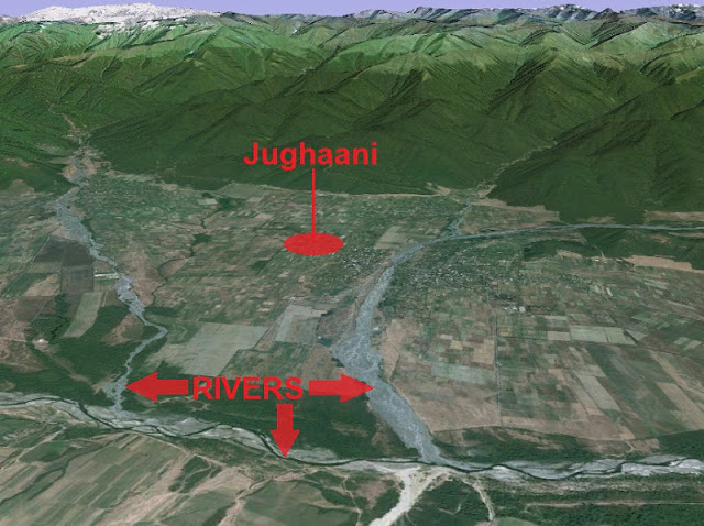 Jughaani stands between three seasonal meltwater rivers at the foot of the Caucasus Mountains (view on map). This village is 35 miles from Didi-lilo, the town where Stalin's great-grandfather, Zaza Jughashvili (an Ossetian), supposedly first settled in Georgia c.1804 (full details below).