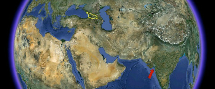 Georgia outlined in yellow, and the Gulf of Khambhat (formerly the Gulf of Cambay), India, marked by the red arrow.