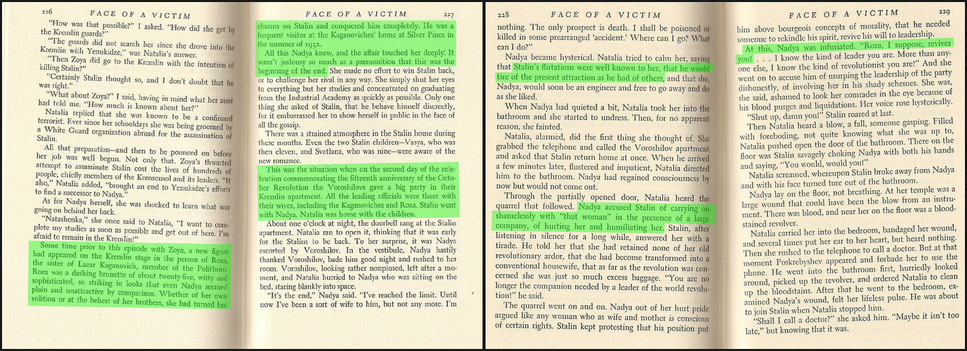 Translated from Russian and published in England in 1956 Face of a Victim is the autobiography of Elizabeth Lermolo. A woman who fled Russia, arriving in the US in 1950. The book tells the story of the death of Stalin's second wife Nadezhda (Nadya) as witnessed by Natalia Trushina, who was employed as a housekeeper in Stalin's home, and who in 1937, Elizabeth Lermolo shared an NVKD prison cell with. The phantom Rosa (Roza) Kaganovich, with whom Stalin was allegedly having an affair, was whom Stalin and his wife were arguing about before she died.