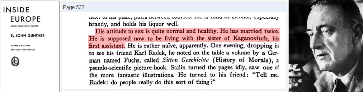 Nothing could be more unlikely than the story spread in the West about "Stalin's third wife" — the mythical Rosa Kaganovich. Aside from the fact that I never saw any "Rosa" in the Kaganovich family, the idea that this legendary Rosa, an intellectual woman (according to the Western version, a doctor), and above all a Jewess, could have captured my father's fancy shows how totally ignorant people were of his true nature; such a possibility was absolutely excluded from his life.