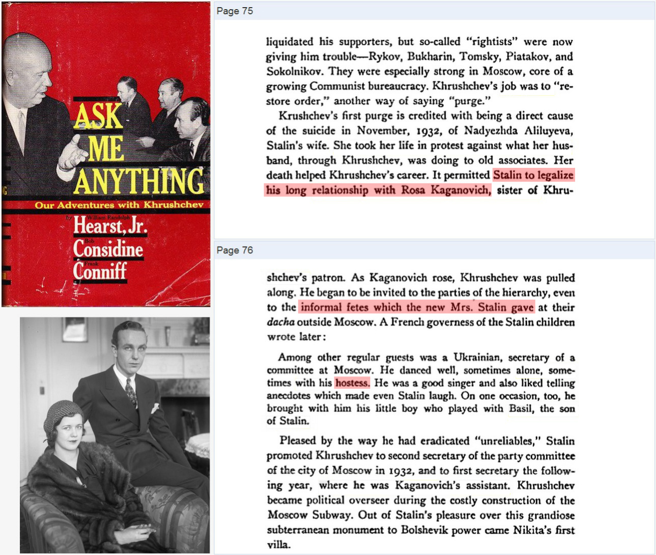 Kruschev of the Ukraine was published in London in 1957 by the Jewish publisher Victor Gollancz. It was written in French, by Russian exile Victor Alexandrov, who was born is St. Petersburg but moved to the United States. He wrote many books on 20th century Russia & the Soviet Union, mostly it seems in French. In this biography of Stalin's successor Nikita Khrushchev, Rosa Kaganovich did exist, and she married Stalin in early 1933.