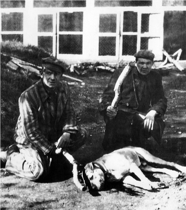 "Former prisoners at Dachau concentration camp kneel by the dog they killed with clubs. Prisoners