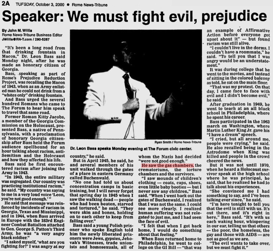 This isn't the first time that Bass has been reported as claiming he saw gas chambers at Buchenwald; an article in The Rome News-Tribune stated that Bass had claimed to have seen gas chambers whilst addressing the Prejudice Reduction Project at Forum Civic Center in Rome, Georgia, on October 2, 2000.
