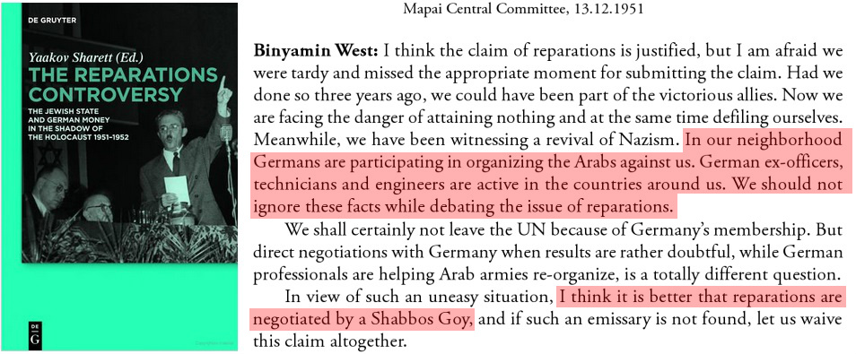 The very same Binyamin West said the following at a meeting of Mapai members on December 13, 1951:
