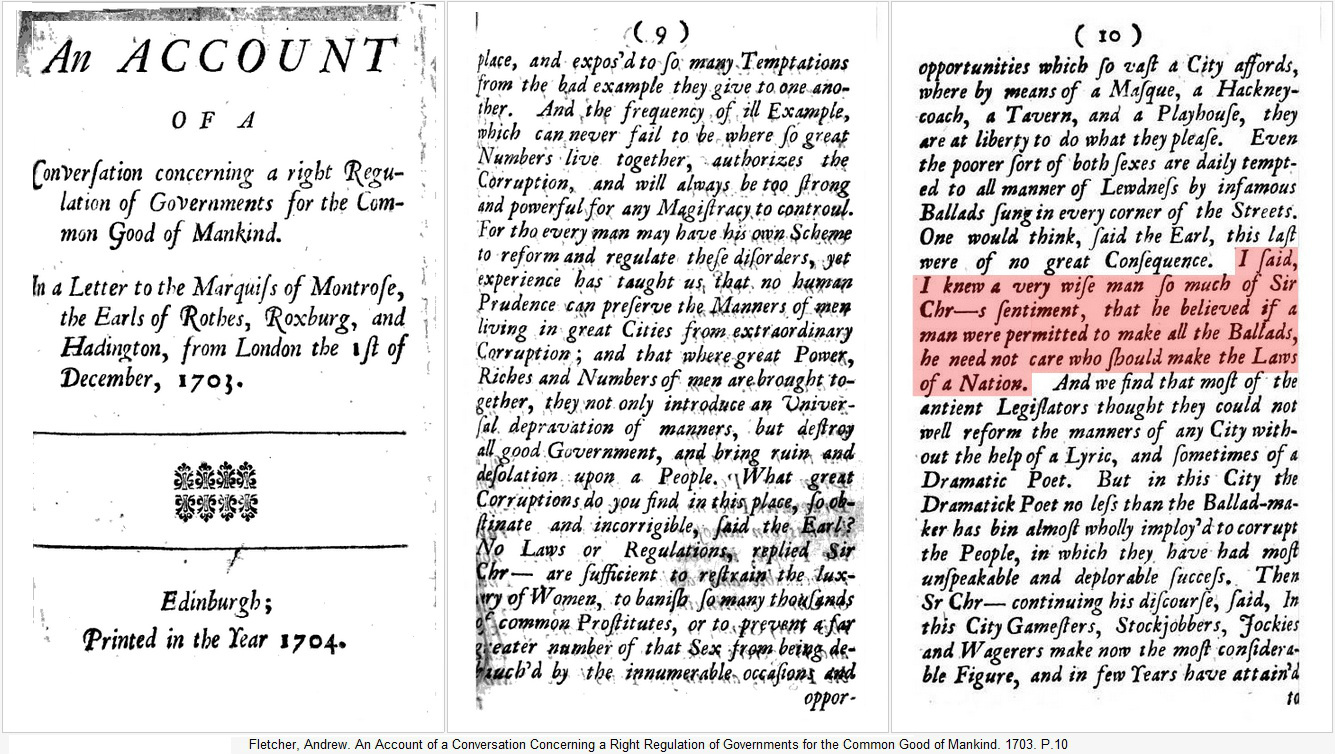 is perhaps more accurate) Fletcher, or misattribute a paraphrasing of the quote to Sidney—who did actually write ballads. Several publications describe the quote (whilst paraphrasing it) as a "maxim" or an "aphorism." Although I'd not previously heard it before I begun to do some research for this post, it's clear that the quote, although always paraphrased, was once very famous, probably still is amongst more well-read folk, and understandably so—it's very amusing.